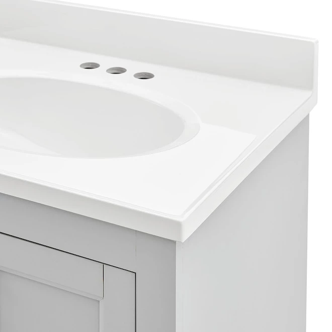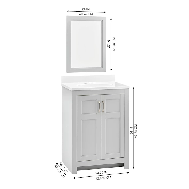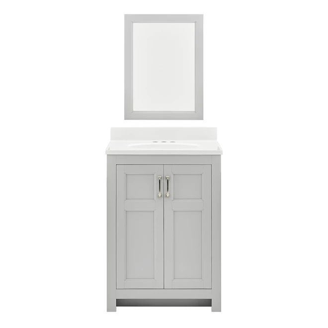 This bathroom vanity combo is transitional charmer with an emphasis on versatility and storage. The vanity boats a timeless light grey finish, a white composite top with an integrated oval basin, brushed nickel hardware and a matching 24-inch-wide mirror. The adjustable floor levellers are standard, and the top is pre-drilled for any 4-inch faucet and drain kit (sold separately). Finally, it has 2 doors and an adjustable shelf so you can organize your bathroom items just as you like. This product’s overall dimensions, including backsplash, are 25-in W x 19-in D x 37-in H. It comes with a 1-year limited warranty.