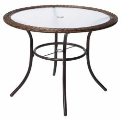 The classic style of this Spruce Hills patio dining table is sure to complement the look of your outdoor decor. Its durable steel frame is covered in a weather-resistant wicker material, and it comes with everything you’ll need to assemble it. Pair this glass top, round table with your existing patio furniture or purchase matching Spruce Hills patio chairs (sold separately) for a coordinated look. This product is backed by a 1-year limited warranty.
