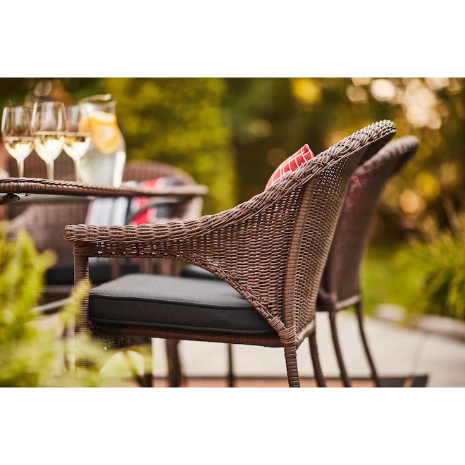 The classic style of this Spruce Hills patio chair is sure to complement the look of any outdoor space. Its durable steel frame is covered in wicker material that is weather-resistant, and it has a fully welded design. This chair comes pre-assembled, so you can easily enjoy your new setup right out of the box. This outdoor chair can even be stacked for easy storage. Add it to your existing patio furniture or pair it with the Spruce Hills patio sofa for a coordinated look. This product comes with a 1-year limited warranty.